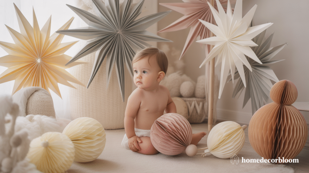 Paper ornaments are a beautiful and budget-friendly way to elevate Minimal Christmas Room Decor for Kids while keeping the space light, playful, and perfectly Nordic. Scandinavian décor often incorporates handcrafted elements, and paper decorations fit this theme flawlessly. Honeycomb balls, folded paper stars, snowflakes, and mini garlands add a delicate festive charm without creating clutter.