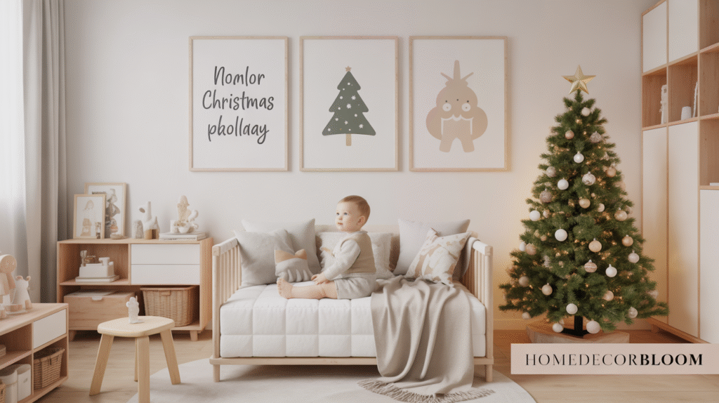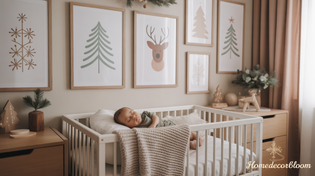 This approach keeps the walls stylish yet serene perfect for a child’s room where balance matters. Scandinavian wall art gently reinforces the festive mood without overwhelming the minimalist setup. Combined with cozy textiles and soft lighting, it completes the harmonious and modern Christmas aesthetic beautifully.