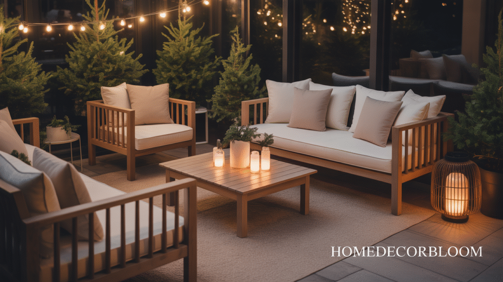 Add subtle touches such as neutral-colored cushions, soft throws, or small potted evergreens to enhance comfort while complementing the warm illumination. This approach highlights the elegance of your minimalist outdoor Christmas decor while making the seating area functional and welcoming for evening gatherings.