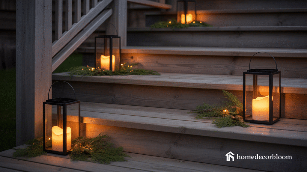 Adding lanterns on the porch or steps is a timeless approach to elevate your Outdoor Christmas Decor with Warm Lighting. Lanterns provide a warm, inviting glow that instantly makes your entryway feel festive yet understated. Opt for minimalist lantern designs with warm LED candles or fairy lights inside to maintain a clean and elegant aesthetic. This simple addition can transform ordinary steps into a charming holiday focal point.