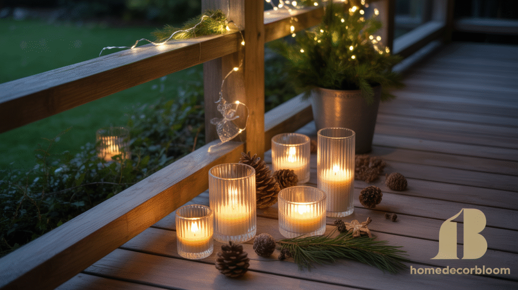 Incorporating minimalist outdoor candle displays can instantly elevate your Outdoor Christmas Decor with Warm Lighting. Grouping a few candles in glass holders or lanterns along your porch, steps, or garden creates a soft, inviting glow that feels festive yet understated. Candles provide warmth and charm without overwhelming your outdoor space.