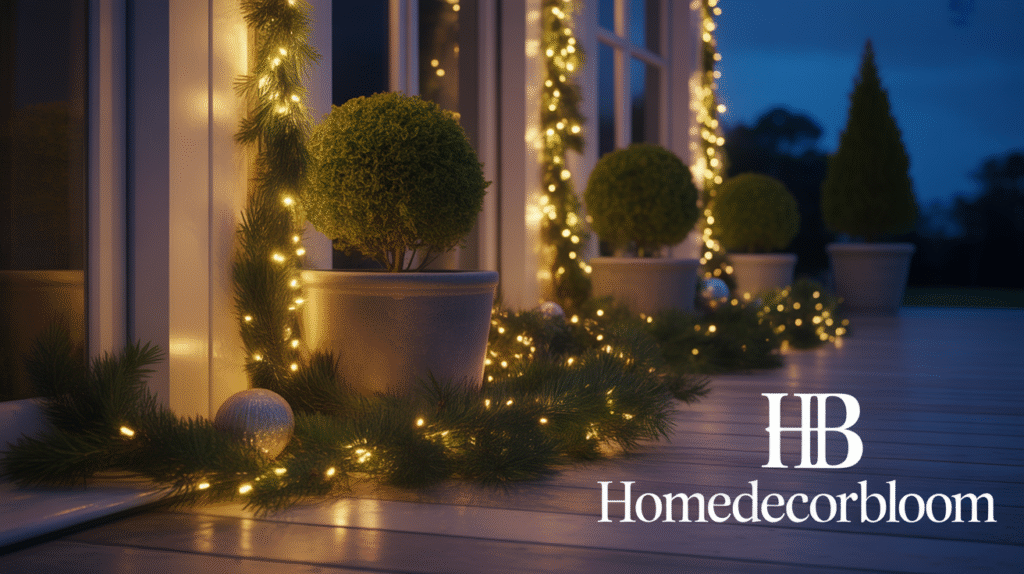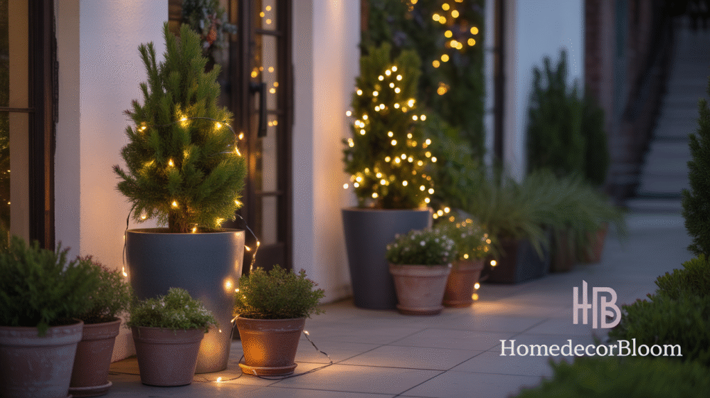 This technique is highly adaptable, allowing you to change plant arrangements or lighting each year to refresh your Outdoor Christmas Decor with Warm Lighting. The combination of greenery and warm light creates an inviting, elegant, and minimalist aesthetic, making your outdoor space feel cozy and festive without excessive decoration.
