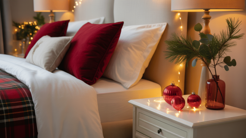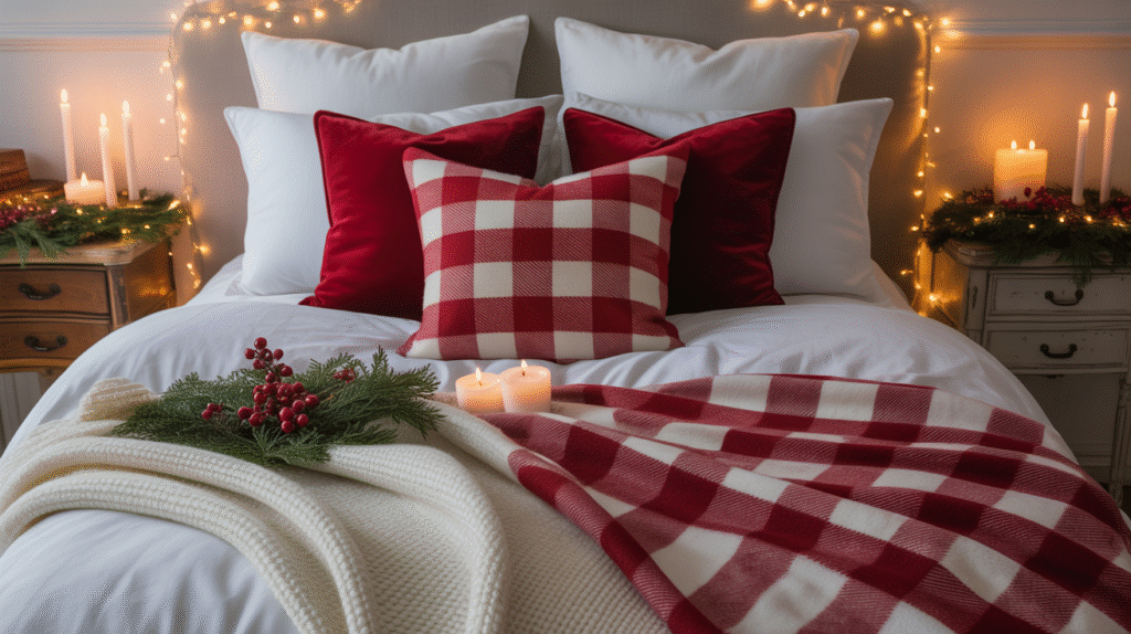 Adding red-and-white plaid accents is an effortless way to bring classic Christmas charm into your bedroom while keeping the look warm and romantic. Plaid patterns instantly add personality and coziness, making the space feel festive without needing bold décor changes. A single plaid element can refresh the entire room.