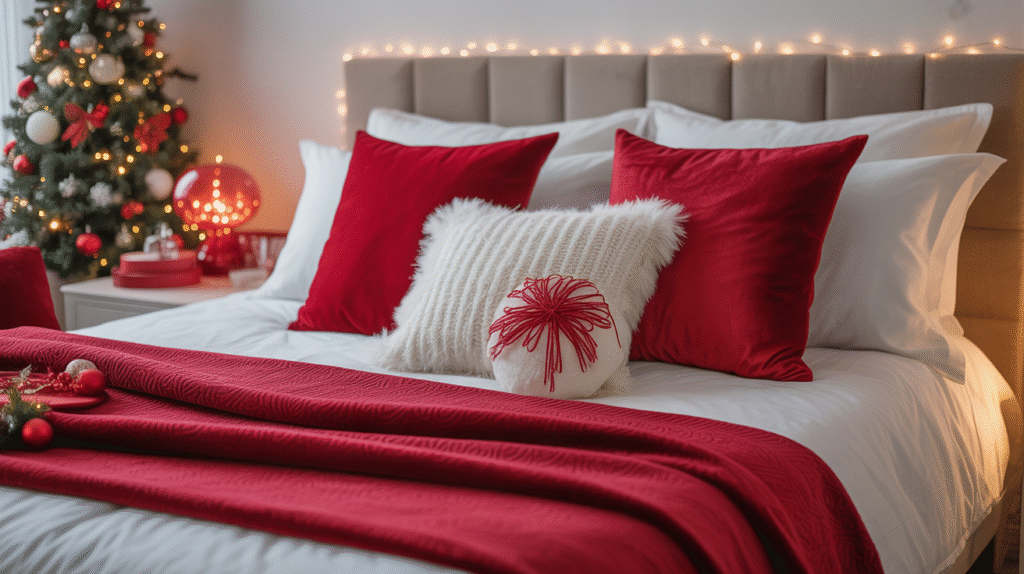 Red accent pillows are one of the easiest ways to bring bold Christmas charm into your bedroom without overwhelming the space. Whether you prefer velvet, knitted, embroidered, or patterned designs, these pillows instantly create a romantic and festive focal point. They also let you experiment with the red-and-white palette in a flexible, budget-friendly way.