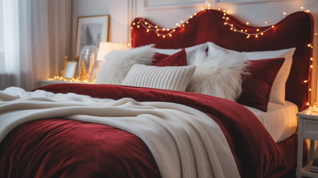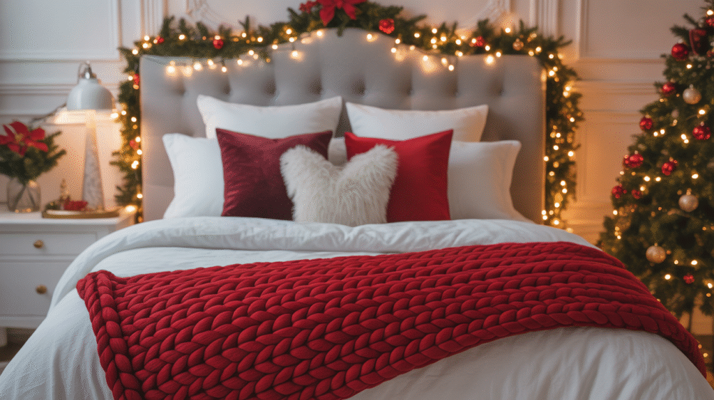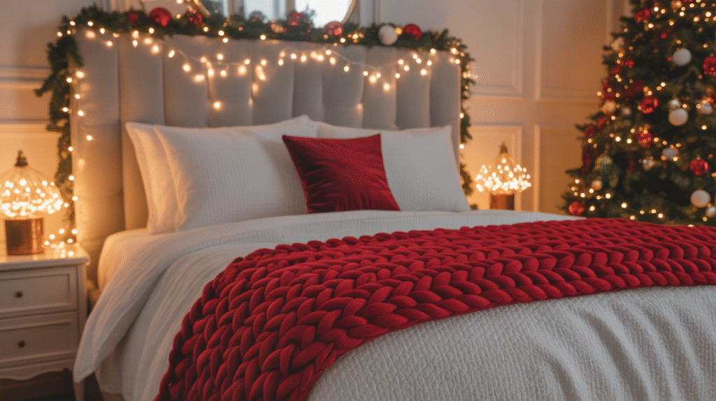Choose textures like chunky knit, velvet, or brushed fleece to enhance the cozy factor. These fabrics not only look luxurious but also photograph beautifully, making your bedroom feel Pinterest-perfect with minimal effort. Pairing the red throw with soft white bedding creates a crisp contrast that elevates the festive aesthetic.