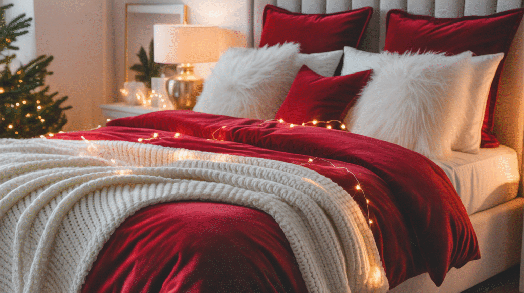 Transform your bedroom instantly by introducing red velvet bedding as the centerpiece of your Christmas makeover. Velvet naturally brings depth, richness, and a soft romantic glow to the room, making it the perfect foundation for a red-and-white holiday theme. Even a single swap — like a velvet duvet cover — elevates the entire space with festive warmth.