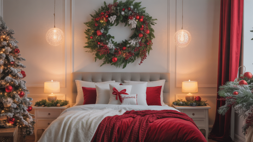 For a more romantic feel, opt for wreaths with subtle warm lights or satin ribbon tails that drape gracefully. These details add warmth, dimension, and softness — ideal for creating that Pinterest-perfect Christmas bedroom atmosphere. It’s a small upgrade with big visual impact.