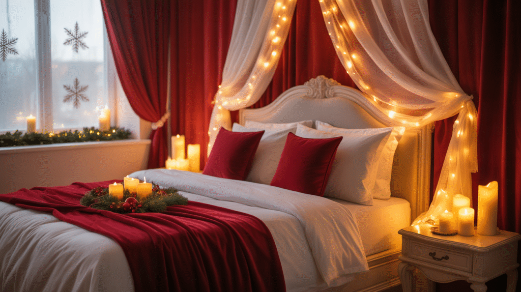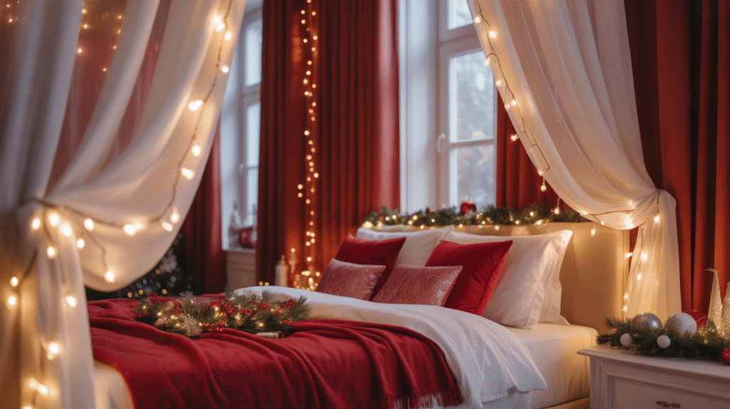 Pairing white curtains with warm string lights or nearby candles elevates the cozy holiday atmosphere even more. The glow reflects beautifully off the soft fabric, creating that dreamy, magical ambiance perfect for a romantic Christmas setting. This combination makes your bedroom look warm and photo-ready with minimal effort.