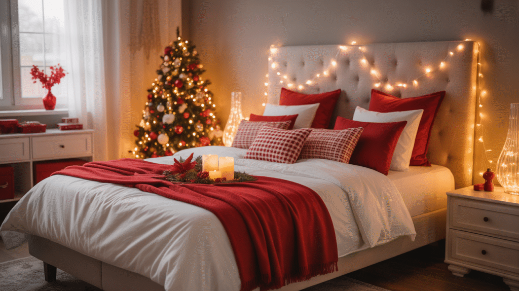 Warm string lights are one of the most transformative elements you can add to a Christmas bedroom. Their soft golden glow instantly creates a magical, romantic atmosphere that enhances every red and white detail in the room. Even a simple strand along the headboard or curtains can make the entire space feel cozy and inviting.