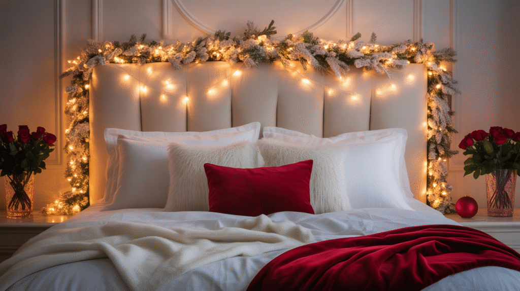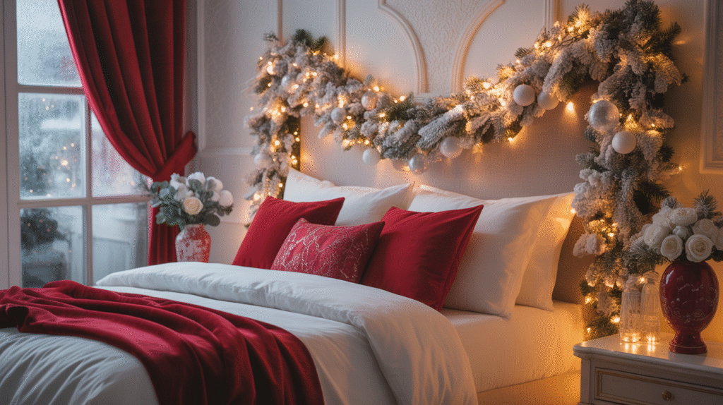 A white Christmas garland draped above the headboard instantly turns your bedroom into a romantic holiday retreat. The snowy texture softens the wall space and creates a dreamy backdrop that pairs beautifully with red accents in the room. It’s an easy, affordable upgrade that adds major visual impact.