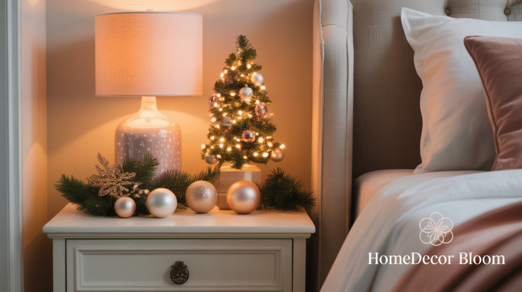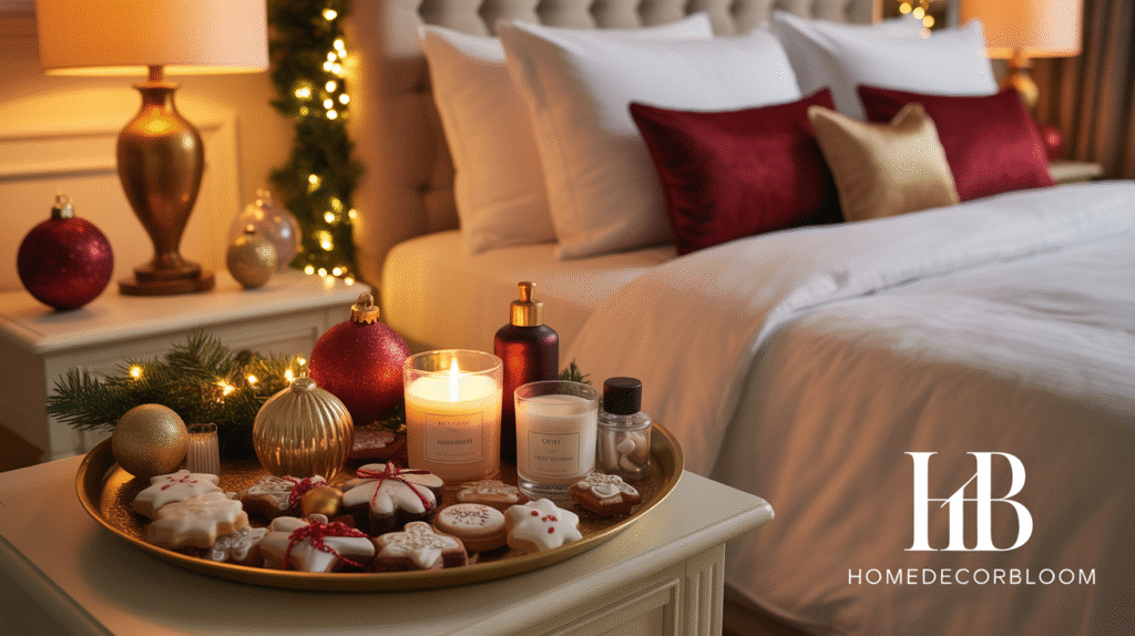 Creating a thoughtful and festive bedside area is a simple way to make your Christmas guest room feel warm, welcoming, and well-prepared for holiday visitors. A styled nightstand instantly elevates the room and adds functional charm — a key detail in polished guest bedroom Christmas décor.