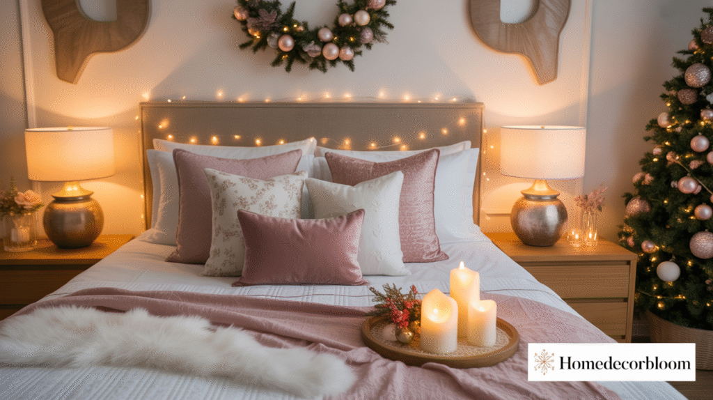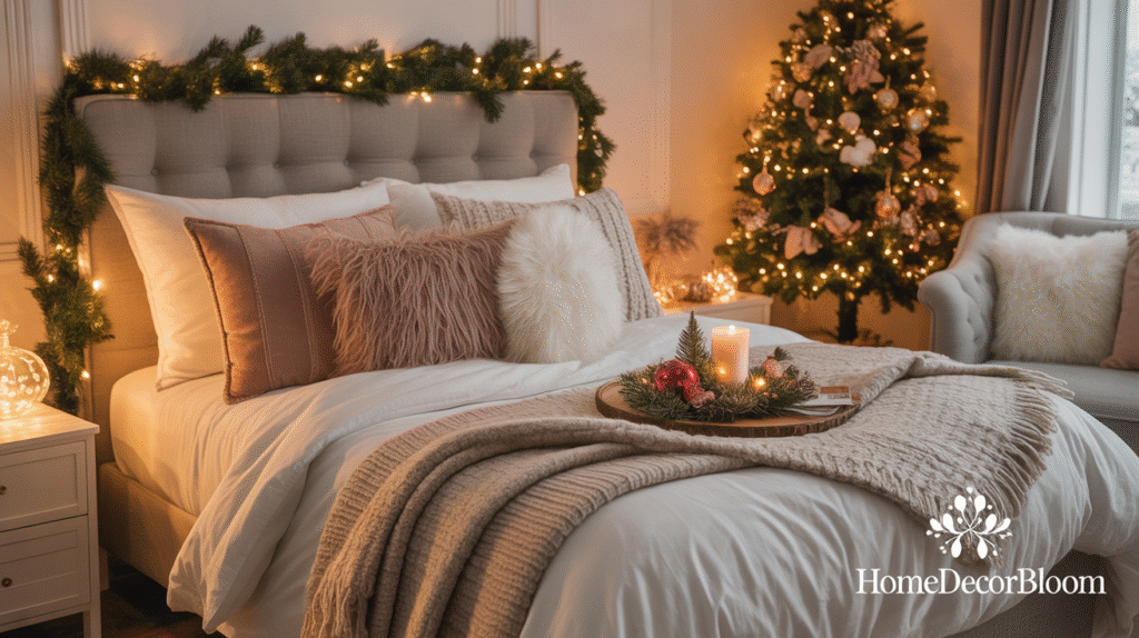 Choose a mix of textures—knit, velvet, faux fur, and linen—to create depth. Incorporate subtle seasonal colors like burgundy, forest green, champagne gold, or winter white. For an extra touch, include a couple of pillows with soft Christmas patterns or wording to enhance the guest bedroom Christmas décor without overwhelming the space.