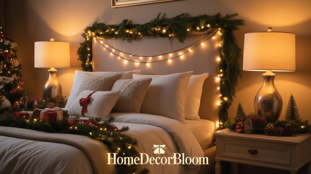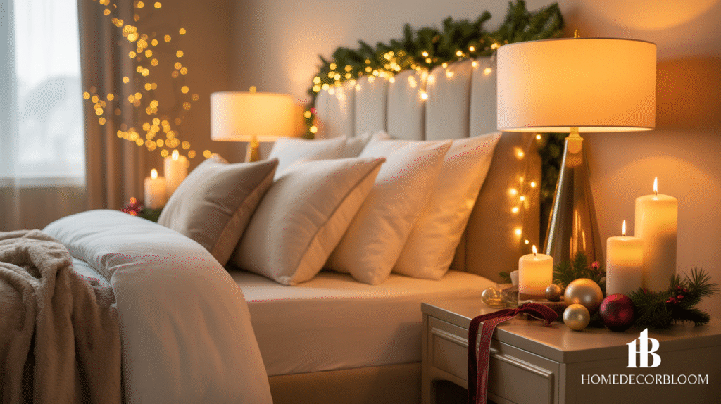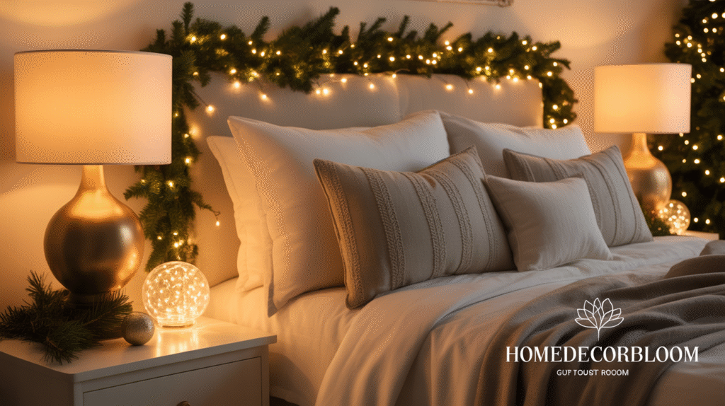 Consider adding table lamps, string lights, or small bedside lanterns to create layers of soft illumination. These lighting touches beautifully complement your cozy Christmas room ideas by creating a warm, inviting mood your guests will love. A small illuminated wreath or LED candle on a nightstand can also introduce just the right amount of festive charm.
