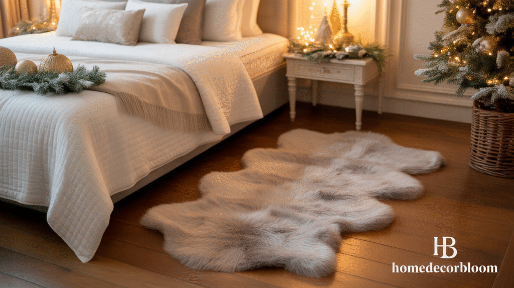 Choose rugs in warm tones such as cream, beige, soft red, winter grey, or subtle holiday patterns. Faux fur rugs are especially popular because they feel luxurious and match beautifully with guest bedroom Christmas décor. Placing one beside the bed ensures guests step onto something warm and soft first thing in the morning — a small detail that goes a long way.