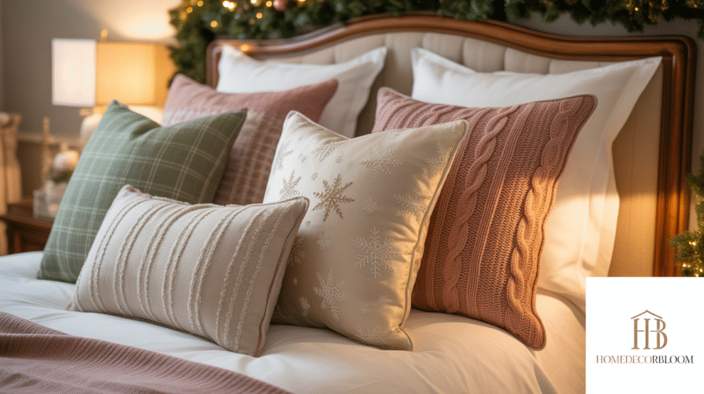 Layered pillows are one of the easiest ways to transform your Christmas guest room into a warm and inviting holiday haven. They instantly add volume, comfort, and festive personality, making the bed feel thoughtfully styled and ready for special visitors.