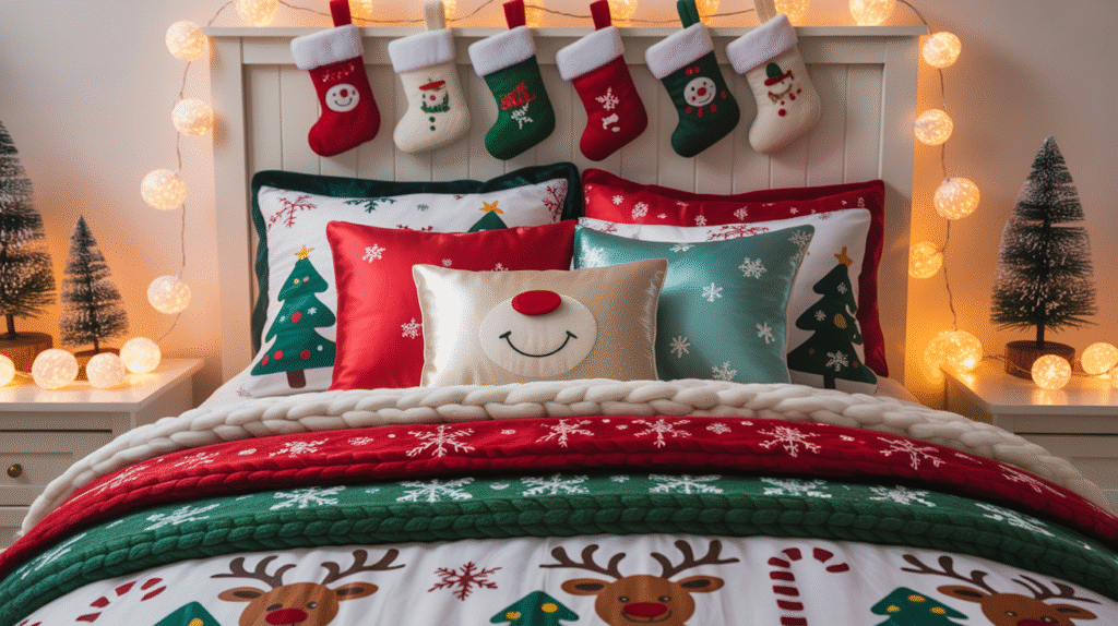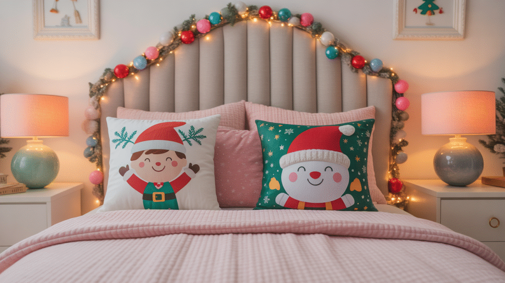 Adding colorful throw pillows is one of the easiest ways to brighten up a Whimsical Christmas Bedroom and make it feel instantly festive. Kids love fun shapes like snowmen, reindeer, gingerbread characters, or sparkly stars. These pillows add personality, comfort, and a cheerful pop of color that makes the room feel joyful and holiday-ready.