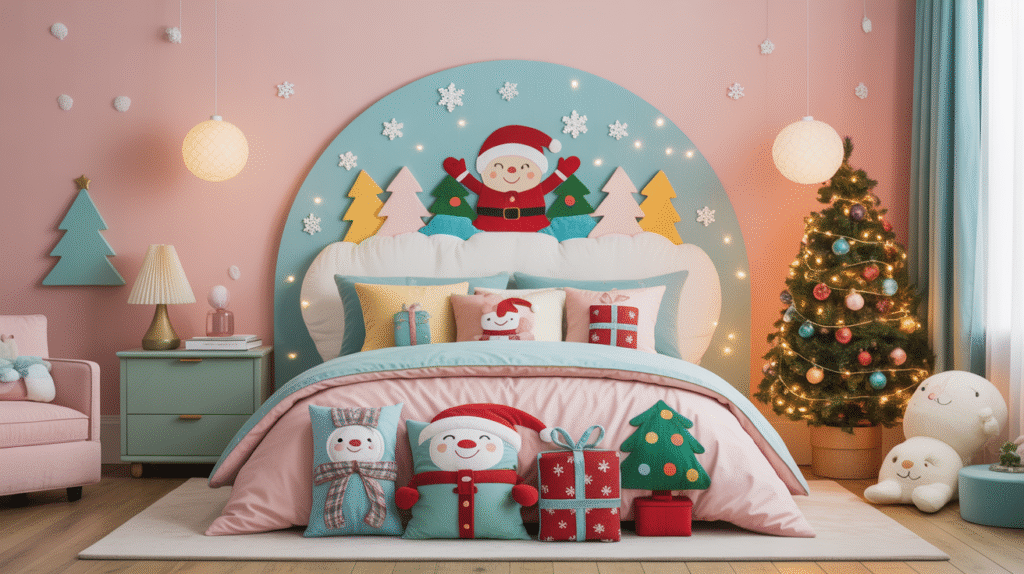 This simple accessory is also highly SEO-friendly when described using terms like kids Christmas pillows, holiday bedding accessories, and festive winter decor for children. Throw pillows complete the room’s look, making it warm, whimsical, and full of holiday charm.