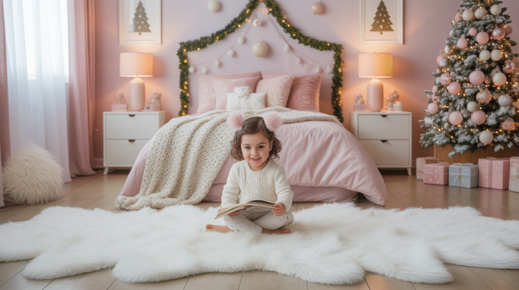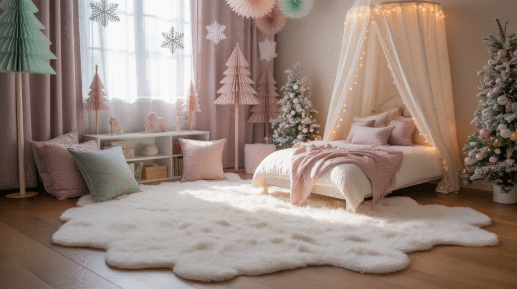 Adding a faux snow rug is a charming way to enhance a Whimsical Christmas Bedroom, creating a snowy landscape that feels straight out of a storybook. It blends beautifully with lights, pastel colors, and festive decor, completing the magical winter wonderland theme kids adore.