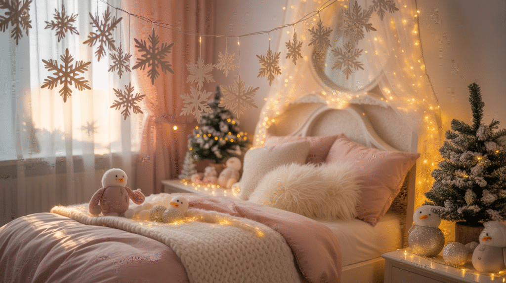 This idea is also SEO-optimized with supportive keywords like kids fairy light decor, Christmas bedroom glow, and snowflake room decorations. These whimsical touches bring warmth and holiday excitement to your child’s space without overwhelming the room.