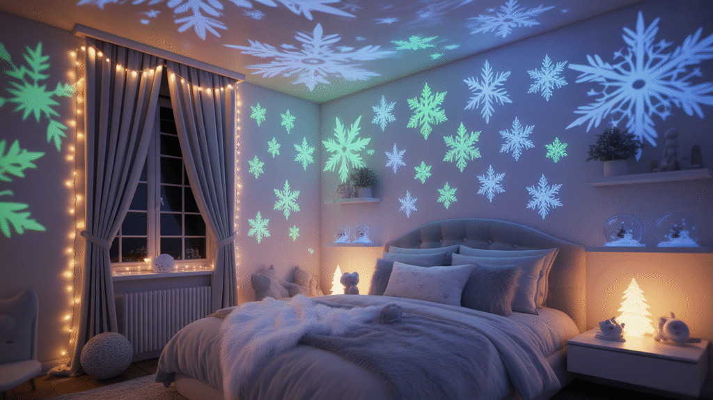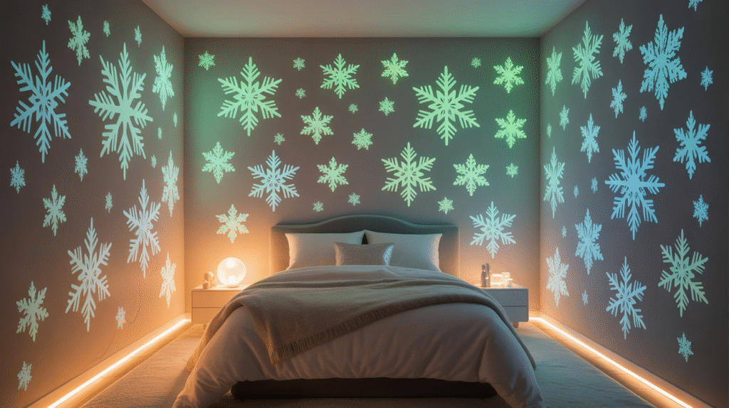 Glow-in-the-dark wall decals are an easy way to turn a child’s bedroom into a nighttime wonderland. Snowflakes, stars, or cute winter characters create a magical effect once the lights go out. Kids love the soft glow, and it adds a calming, comforting atmosphere that feels festive and fun.