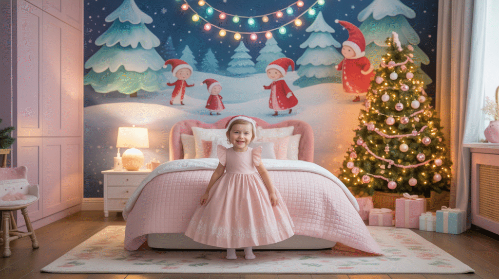 A soft, enchanting glow can instantly transform your child’s room into a dreamy, Whimsical Christmas Bedroom filled with wonder. Hanging warm fairy lights along the headboard, ceiling, or window frames creates a magical sparkle kids absolutely adore. These gentle lights set the perfect nighttime mood—calming, cozy, and delightfully festive.
