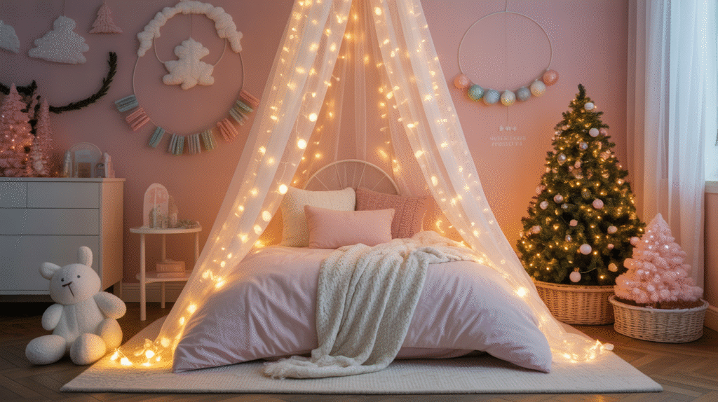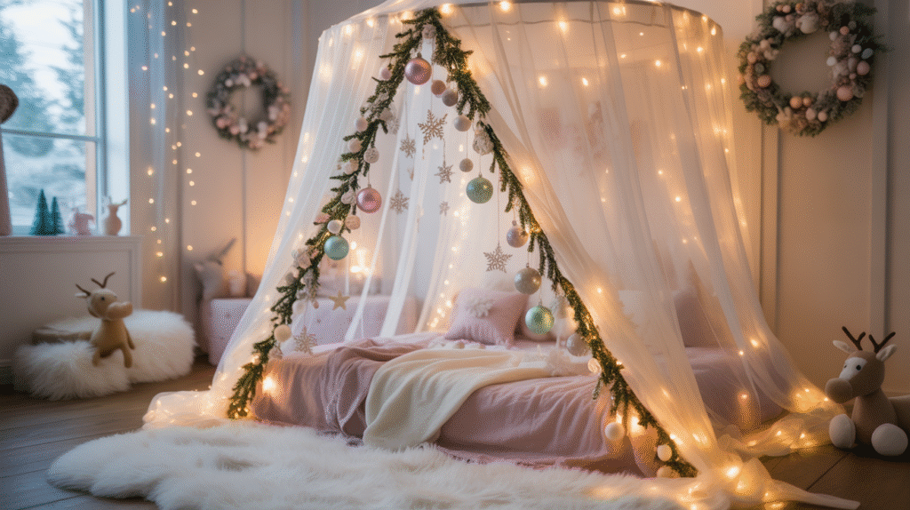 You can use sheer white or pastel fabric to create the canopy, then weave warm fairy lights throughout. This makes the bed feel like a glowing snowy hideout. Kids adore the sparkling effect, and it adds a beautiful centerpiece to the overall holiday theme. Even during the day, the canopy looks whimsical and elegant.
